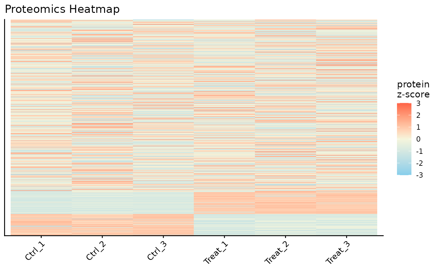 Finally, we can visualize the expression patterns of the proteins across our samples using a heatmap. The data is automatically Z-scored by row to highlight relative expression changes.